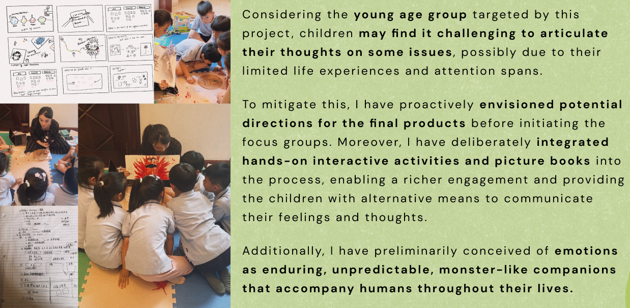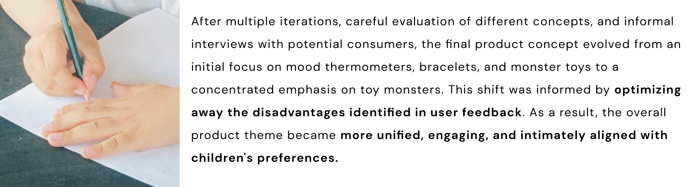 After careful consideration of both children's and parents' needs and their dynamic interaction, I have decided on a combination of physical products and digital applications as the final product format, all centered around the theme of "Emotion Monsters." Additionally, the digital products will include a tablet version tailored for children and a mobile version for parents, each featuring completely distinct content.