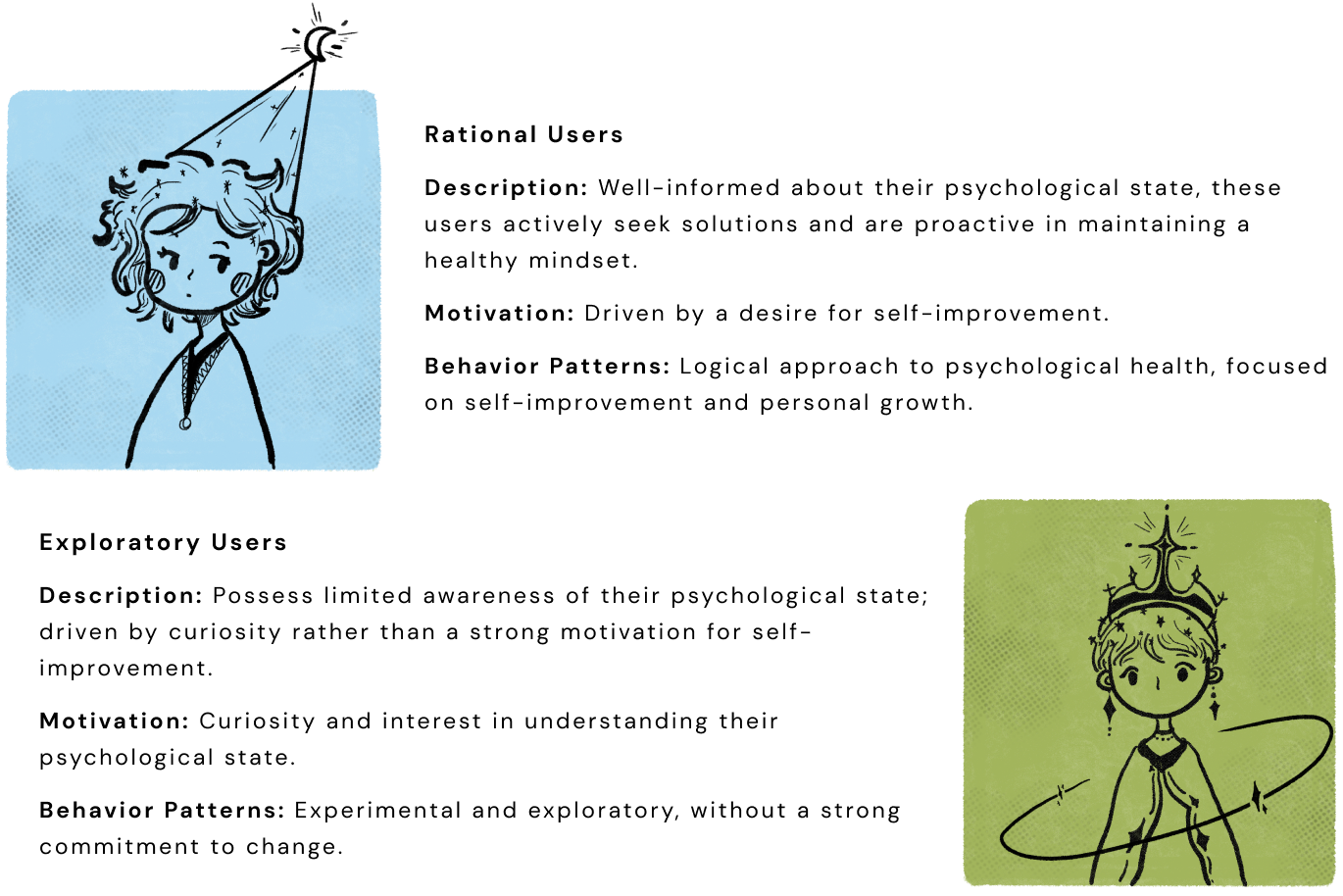 I initially categorized current users into two groups based on their motivations for using the applications and their behavioral patterns: rational users and exploratory users.After cross-referencing user motivations and behavior patterns with their ages, it becomes evident that these categories align significantly with specific age groups.