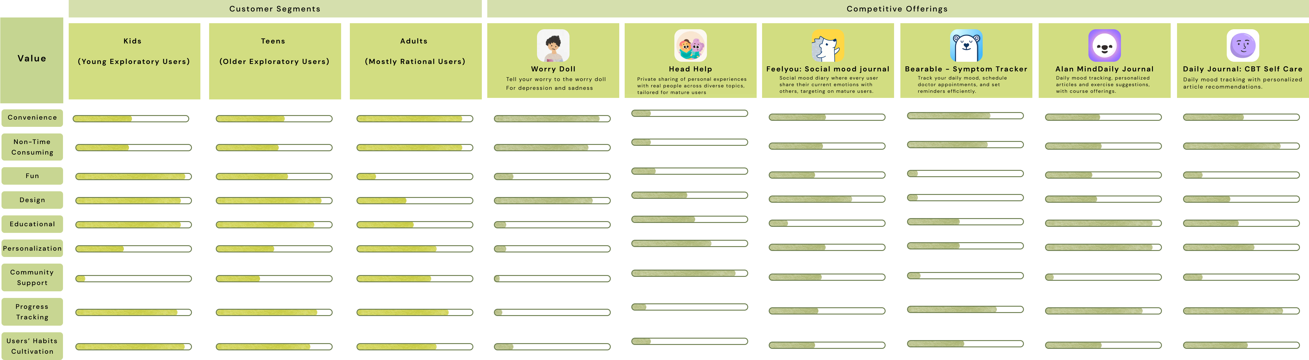 Comparing user values with those of popular mood management applications, it's evident that despite their varied forms and distinctive features, the current market largely overlooks the needs of children. Additionally, very few products focus on developing a lasting, healthy mindset for coping with negative emotions. Instead, most opt for immediate solutions to alleviate current feelings or address immediate challenges.