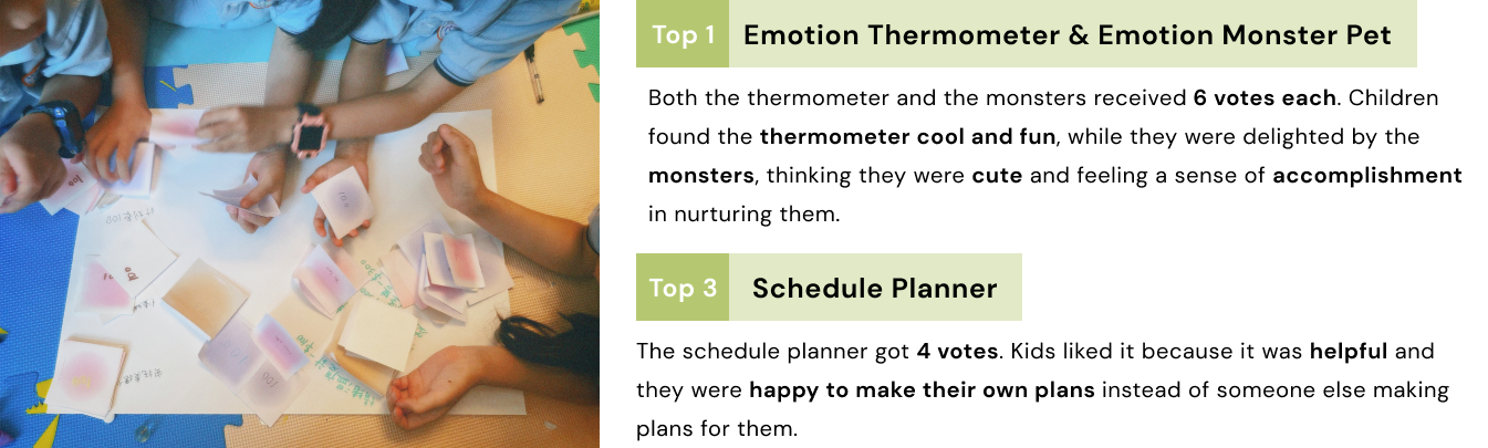 Compared to products meant for family communication or those placed in common family spaces, children showed a preference for private, personal products. They favored items that were fun, interesting, and cute. For instance, the emotion thermometer, which is quite similar to the emotion board or mood diary, received more votes because it appeared more entertaining.
