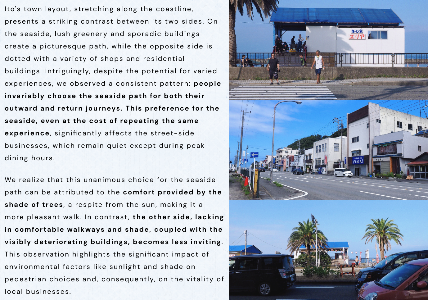 We integrated our observations, feelings, and the collected data into the journey map presented below. This map not only reflects our personal experiences but also incorporates the broader public sentiment, offering a comprehensive view of the potential for revitalization in Ito.