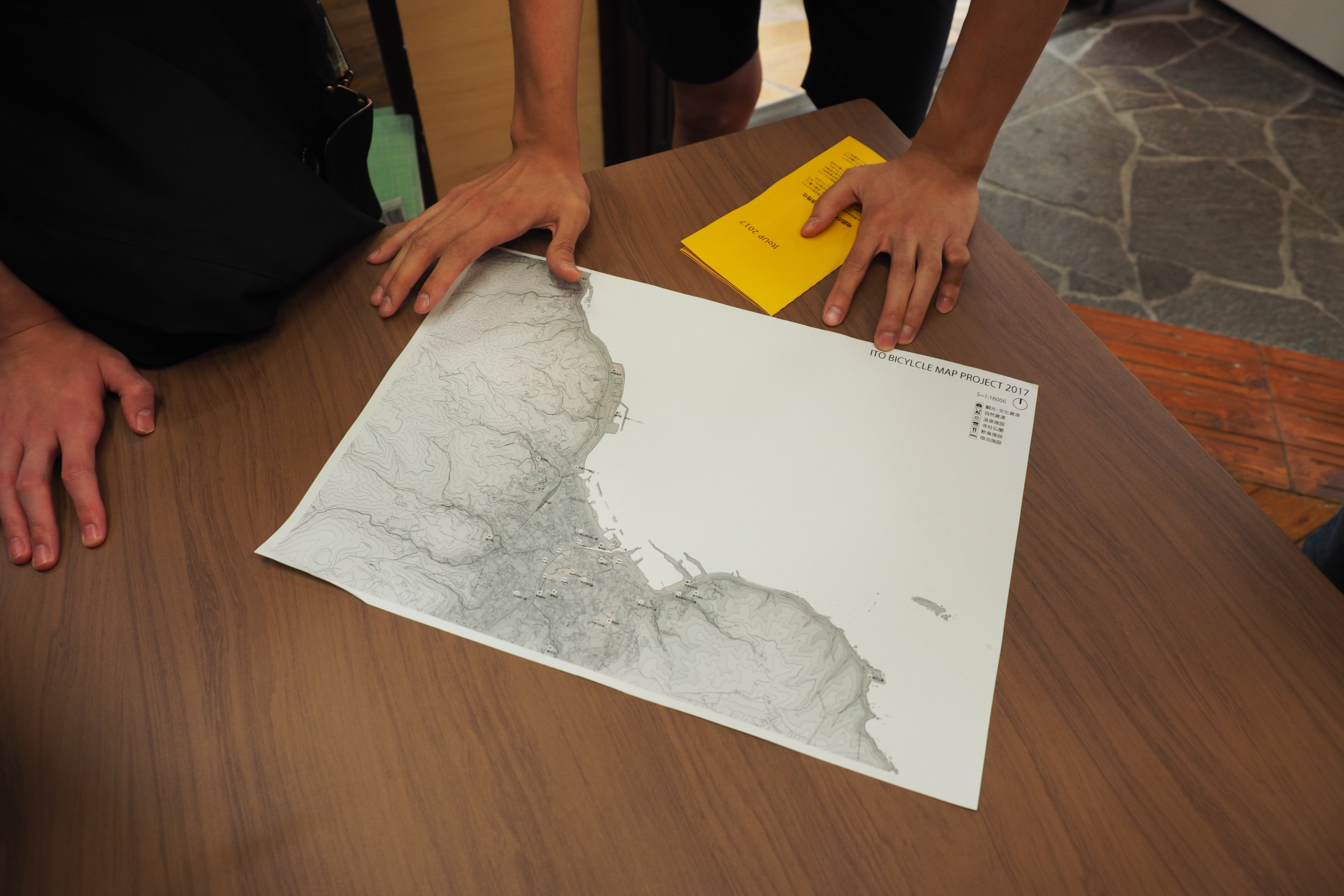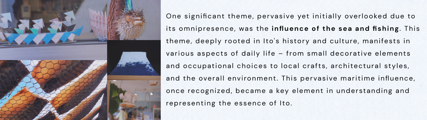 In crafting the cycling route, we employed a hands-on method by printing out photos of potential sites and arranging them alongside a map of Ito. This visual and interactive approach enabled us to intuitively design a route that not only highlighted Ito's rich fishing culture but also ensured a seamless and engaging journey for cyclists. By physically mapping out the journey, we could better understand the geographical and thematic connections between sites, leading to a more coherent and captivating experience.